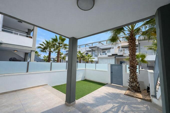 Built in 2017, this stylish apartment comprises of a large open plan living and kitchen area, 2 double bedrooms, 2 family bathrooms with walk in showers of which one is an en suite, an outside laundry area to the rear of the kitchen and a large garden with some artificial lawn laid to the front of the apartment. The garden benefits from a covered porch/patio area to give some shade from the summer sun and is fitted with smoked glass balustrades offering good privacy as you enjoy your outdoor area. This complex is located close to all amenities and benefits from a wonderful communal pool and garden complete with outside dining area and kitchen.